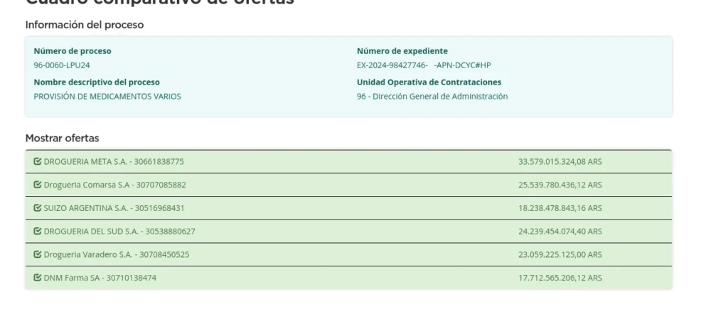 La tercer fue la vencida. La apertura de sobres con las ofertas fue el 11 de diciembre de 2024. Esta vez se presentaron 11 empresas y fueron confirmadas 4. La pulseada estaba otra vez entre Suizo Argentina y DNM Farma. Pero esta vez Suizo Argentina ofertó 15.393 millones de pesos contra 16.882 millones de DNM Farma y se quedó con la licitación.