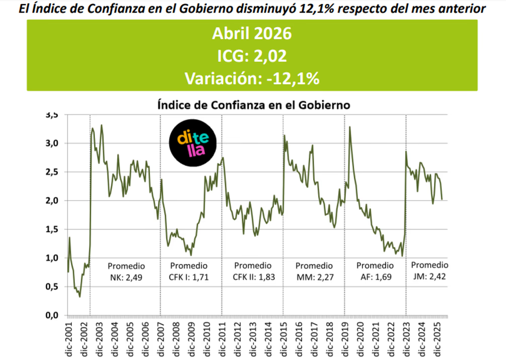 El Índice de Confianza en el Gobierno (ICG) elaborado por la Escuela de Gobierno de la Universidad Torcuato Di Tella muestra a las claras una tendencia preocupante para la Casa Rosada. En abril de 2026, la credibilidad en la administración de Milei se derrumbó un 12,1% y cerró el mes en 2,02 puntos sobre 5, la segunda peor marca de la historia del Gobierno de La Libertad Avanza (LLA), apenas por encima del piso de 1,94 puntos de septiembre de 2025.