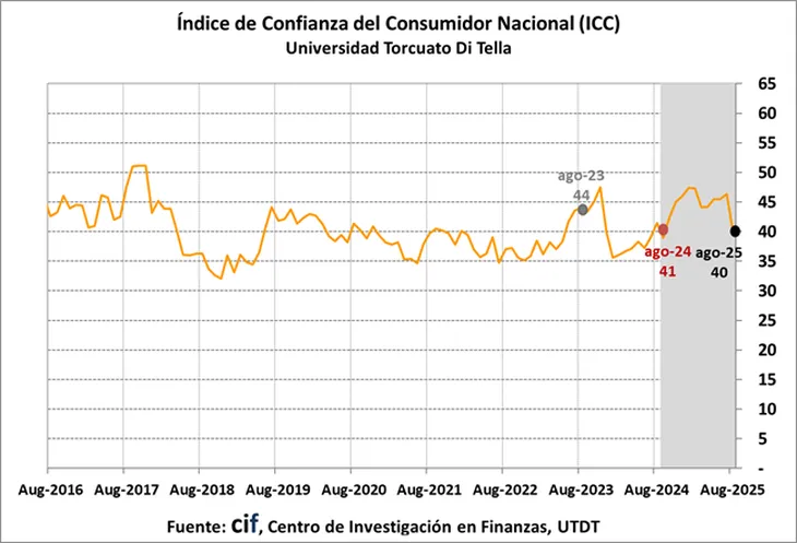 El Índice de Confianza del Consumidor (ICC) de agosto se ubicó un 3,64% por debajo del mismo mes del año pasado, aunque aún está un 12,18% arriba del piso de enero de 2024 (35,60).