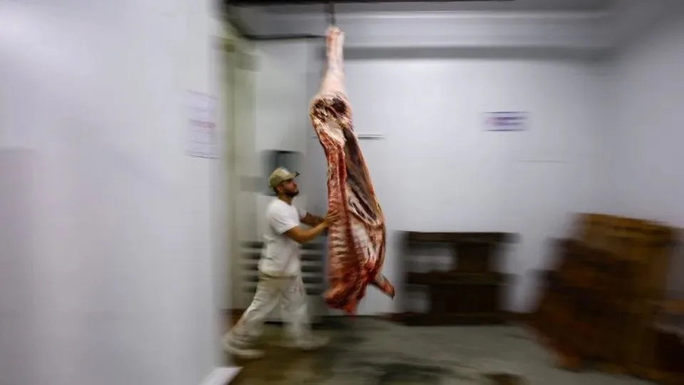 Un trabajador empuja un cadáver de res en una planta procesadora de carne en Morón, Buenos Aires, Argentina, el 16 de mayo. – Agustín Marcarian/Reuters