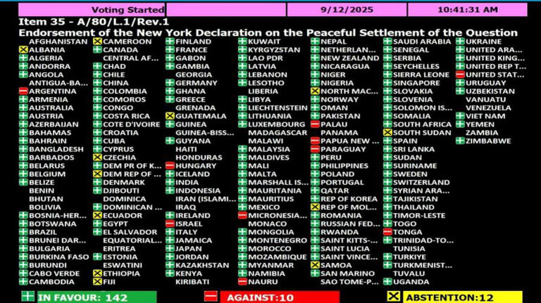La Asamblea General de la ONU respaldó este viernes, con una clara mayoría, una resolución que apoya la llamada Declaración de Nueva York. Esta iniciativa, impulsada por Francia y Arabia Saudita, tiene como objetivo avanzar hacia una solución de dos Estados que permita resolver el conflicto entre israelíes y palestinos. En total, 142 países votaron a favor del texto, mientras que la delegación argentina, presidida por Francisco Tropepi, cumplió con el mandato de Casa Rosada e integró la lista de los diez países votaron en contra en sintonía con Washington y Tel Aviv, mientras que otros doce optaron por abstenerse.