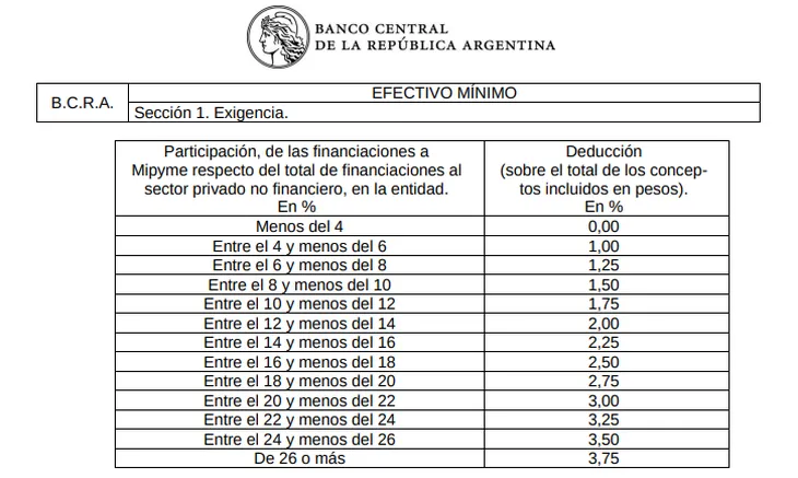 En el caso de que un banco tenga entre el 4% y el 6% de su cartera de créditos al sector privado no financiero integrado por financiamiento a mipymes, entonces desde el primer día de este mes tiene que inmovilizar el 1% sobre el total de créditos en pesos.