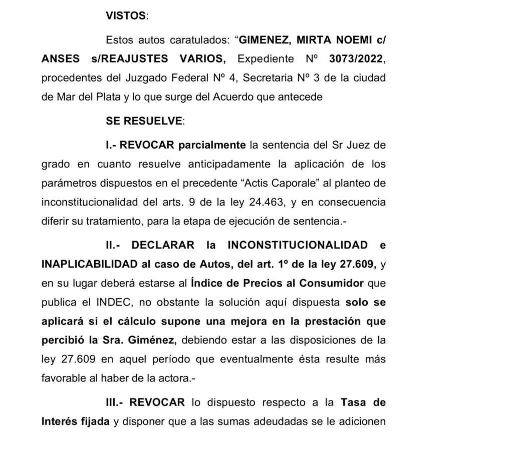 Se trata de un fallo firmado por los jueces Eduardo P. Jiménez y Alejandro O. Tazza, quienes declararon la «inconstitucionalidad e inaplicabilidad» del art. 1º de la ley 27.609, aprobada en diciembre de 2020 y resolvió que la movilidad jubilatoria debe calcularse en base al Índice de Precios al Consumidor que publica el INDEC, lo que supondría haberes jubilatorios más altos que los actuales.