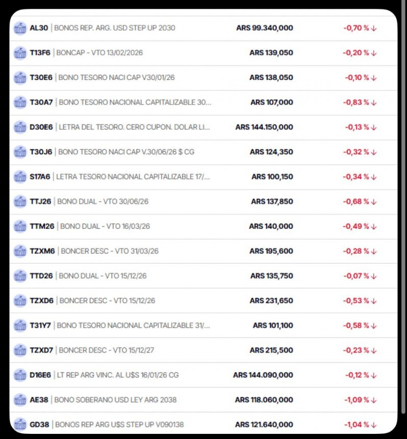 Con ese telón de fondo, los precios de los bonos dejaron de acompañar la narrativa oficial. En pantalla, el AL30 cayó 0,7%, el AE38 bajó 1% y el GD38 retrocedió 1%, entre otros papeles en rojo. Es el modo más sincero que tiene el mercado de decir que está haciendo cuentas que no cierran.