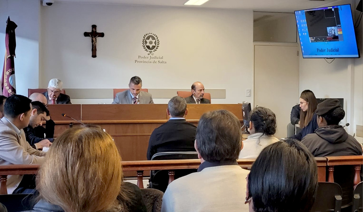 La audiencia de debate se desarrolla con tribunal colegiado integrado por los jueces Leonardo Feans, Martín Pérez y Francisco Mascarello.