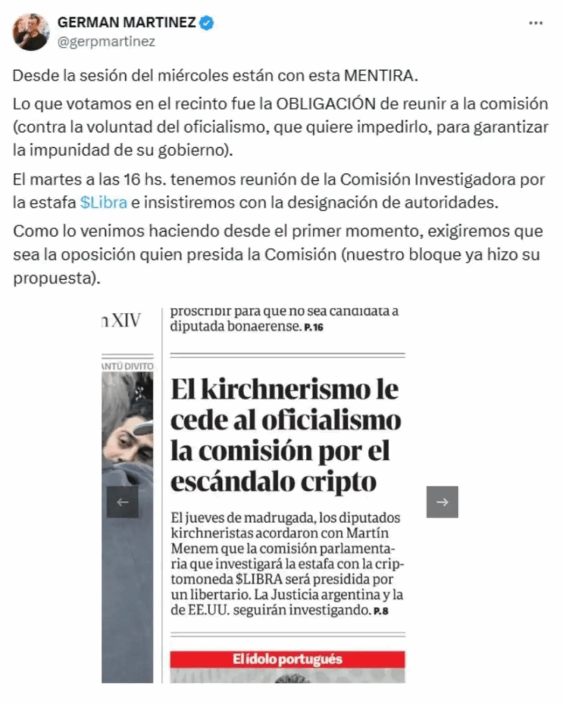 “Desde la sesión del miércoles están con esta MENTIRA. Lo que votamos en el recinto fue la OBLIGACIÓN de reunir a la comisión (contra la voluntad del oficialismo, que quiere impedirlo, para garantizar la impunidad de su gobierno)”, expresó Martínez en su cuenta de X.