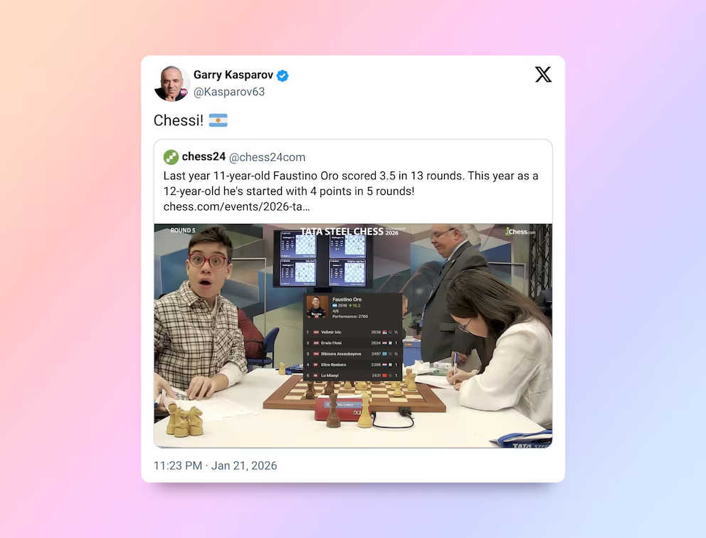 El posteo que eligió para escribir este mensaje era del sitio Chess24com, que remarcaba: “El año pasado, Faustino Oro, de 11 años, anotó 3.5 en 13 rondas. ¡Este año, con 12 años, ha empezado con 4 puntos en 5 rondas!“.