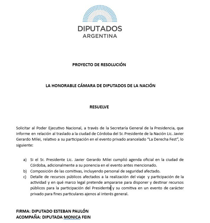 Este uso de los recursos públicos para un acto privado ya generó una presentación en la Cámara de Diputados para que Presidencia informe si Milei cumplió agenda oficial en Córdoba. El legislador socialista Esteban Paulón también requirió que se informe la composición de la comitiva, el detalle de los recursos públicos afectados a la realización del viaje y que se explique bajó que marco legal se destinaron fondos estatales para que Milei vaya a un acto de tinte partidario, que además generó ganancias a una empresa privada.