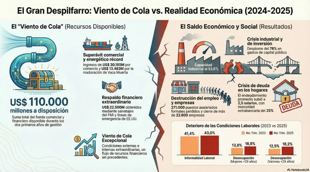 Pese a este impresionante “viento de cola”, el saldo de dos años de la experiencia mileísta es una economía estancada rumbo a la recesión, nula acumulación de reservas internacionales, profundo deterioro sociolaboral, destrucción de empresas y empleos de calidad, aceleración inflacionaria y un ajuste fiscal regresivo que, por la propia lógica del plan económico, se profundiza.