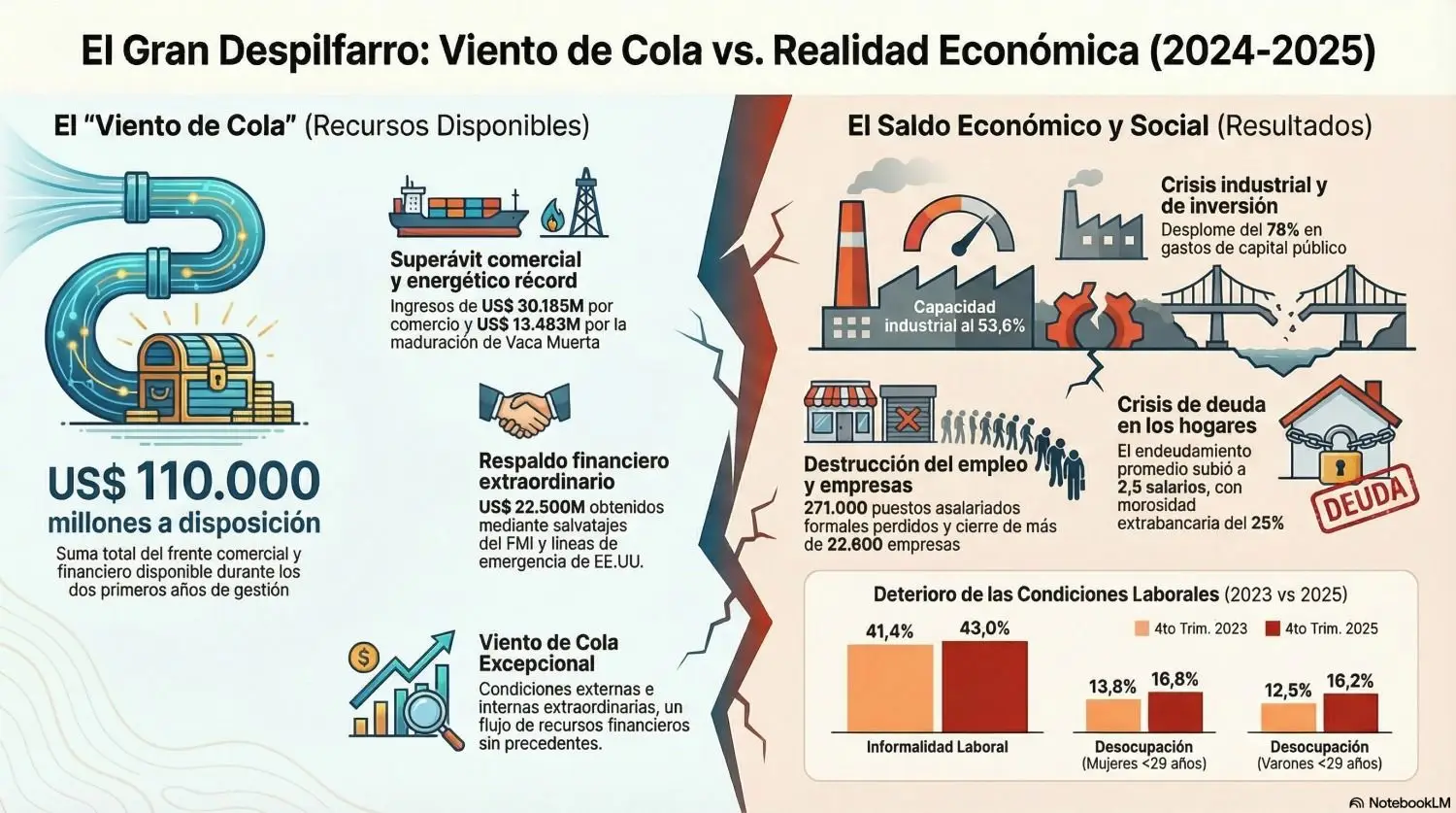 Pese al ingreso extraordinario de 110.000 millones de dólares por cosechas récord, superávit energético y salvatajes del FMI y EE.UU., en poco más de dos años de gobierno, Milei muestra un balance económico paupérrimo. La economía está estancada rumbo a la recesión, la industria opera por debajo de los niveles de la pandemia, se destruyeron 271.000 empleos formales y la morosidad de las familias no para de aumentar.