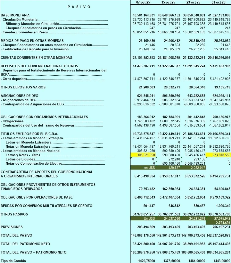 Los balances semanales del BCRA mostraban un pasivo de poco más de 24.000 millones de dólares hasta el 23 de octubre y que saltó a la semana siguiente a 27.076 millones de dólares.
