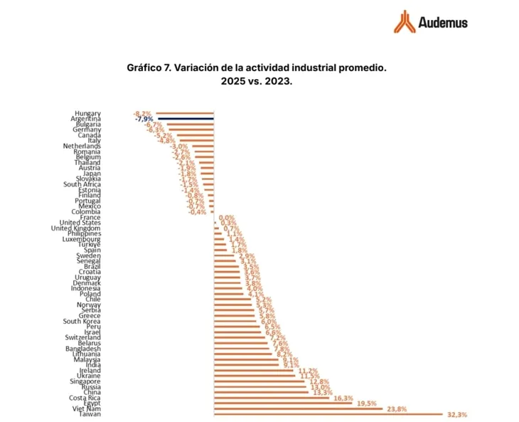 Argentina tuvo el segundo peor desempeño industrial del mundo en los últimos dos años, solo superado por Hungría, según un reciente informe de Audemus en base a datos de Naciones Unidas. El desplome del 7,9% vino acompañado de un veloz cierre de empresas y despidos masivos. El ranking internacional consolida índices para más de 80 países y, a diferencia de lo que ocurrió en otras regiones, la consultora asegura que “no es una complicación importada: es una crisis fabricada en casa”.