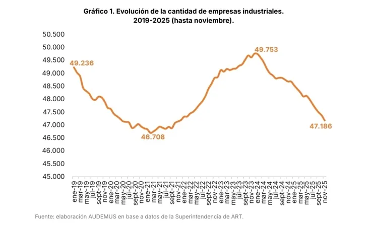 Los datos son alarmantes: el empleo sectorial cayó en 16 de los últimos 24 meses, se perdieron 73.000 puestos de trabajo y unas 2.400 empresas -equivalentes al 5% del total- dejaron de operar en los últimos dos años. Según Audemus, “la crisis actual está generando un daño sobre el entramado empresarial industrial comparable, o incluso superior, al de los episodios más disruptivos de las últimas décadas”.
