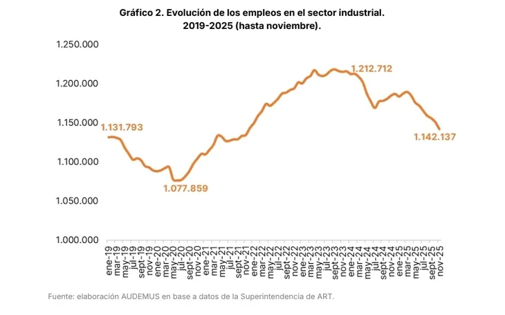 La debacle es tal que entre finales de 2023 y finales de 2025 Argentina tuvo la segunda peor caída de producción industrial del mundo, de acuerdo con el último informe de la consultora Audemus, elaborado con datos de la Organización de las Naciones Unidas para el Desarrollo Industrial (ONUDI), que monitorea índices de unos ochenta países relevantes para la actividad.