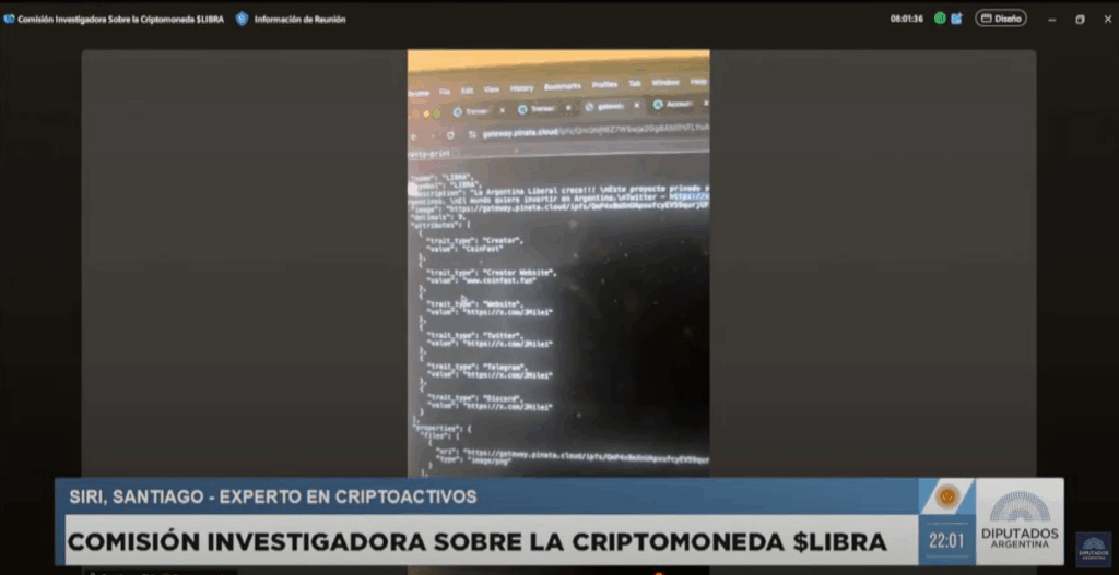 Otro de los expositores que desarmó el discurso gubernamental fue el especialista en cripto Santiago Siri. Comprobó, mostrando en pantalla, cómo se puede ver la información de la creación de $LIBRA y que estuvo asociada a la publicación que hizo el presidente en la red social X. “El lanzamiento del token contiene este mensaje que se referencia en la cuenta de twitter de Milei. El token $LIBRA se crea con esta información” concluyó.