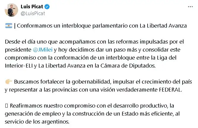 Luis Picat lo comunicó a través de su cuenta en X: “Desde el día uno que acompañamos con las reformas impulsadas por el presidente Javier Milei y hoy decidimos dar un paso más y consolidar este compromiso con la conformación de un interbloque entre la Liga del Interior-ELI y La Libertad Avanza en la Cámara de Diputados”.