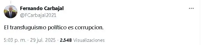 La publicación generó una respuesta de parte de al menos un correligionario. El diputado Fernando Carbajal, del bloque Democracia para Siempre, expresó en la misma red social: “El transfuguismo político es corrupción”.