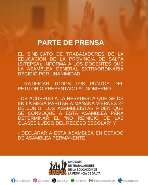 – De acuerdo a la respuesta que se de en la Mesa Paritaria mañana viernes 27 de junio, los asambleístas piden que se convoque a esta Asamblea para determinar el «NO REINICIO DE LAS CLASES LUEGO DEL RECESO ESCOLAR» y