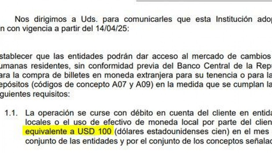 Excepto que pocas horas después se conoció una resolución del Banco Central que limitaba esa posibilidad a 100 dólares por mes por persona, es decir se endureció el cepo, porque antes de estas medidas el límite era de 200 dólares por mes. En el Central afirmaron que la restricción se limita al intento de retirar los billetes por ventanilla, pero si es posible comprar más si se acepta que son dólares electrónicos.