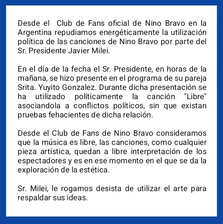 A través de un comunicado publicado en X (antes Twitter), los seguidores del cantante manifestaron: «Desde el Club de Fans oficial de Nino Bravo en la Argentina repudiamos energéticamente la utilización política de las canciones de Nino Bravo por parte del Sr. Presidente Javier Milei».