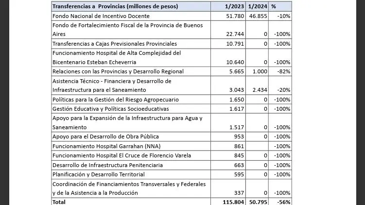 De acuerdo a un informe elaborado por el observatorio Ocipex, el recorte a las provincias fue del 56% en términos reales comparando este enero con enero del año pasado. Sin muchos miramientos, la motosierra pasó por las transferencias de recursos a cajas previsionales provinciales, infraestructura de hospitales, políticas educativas y penitenciarias, entre otros. La provincia de Buenos Aires que gobierna Axel Kicillof resultó la más perjudicada: le recortaron todas las transferencias que no sean del Fondo de Incentivo Docente, incluido el Fondo de Fortalecimiento Fiscal que apunta a reducir las asimetrías de la coparticipación, donde la PBA aporta aproximadamente el 40% de la masa coparticipable y recibe apenas la mitad.