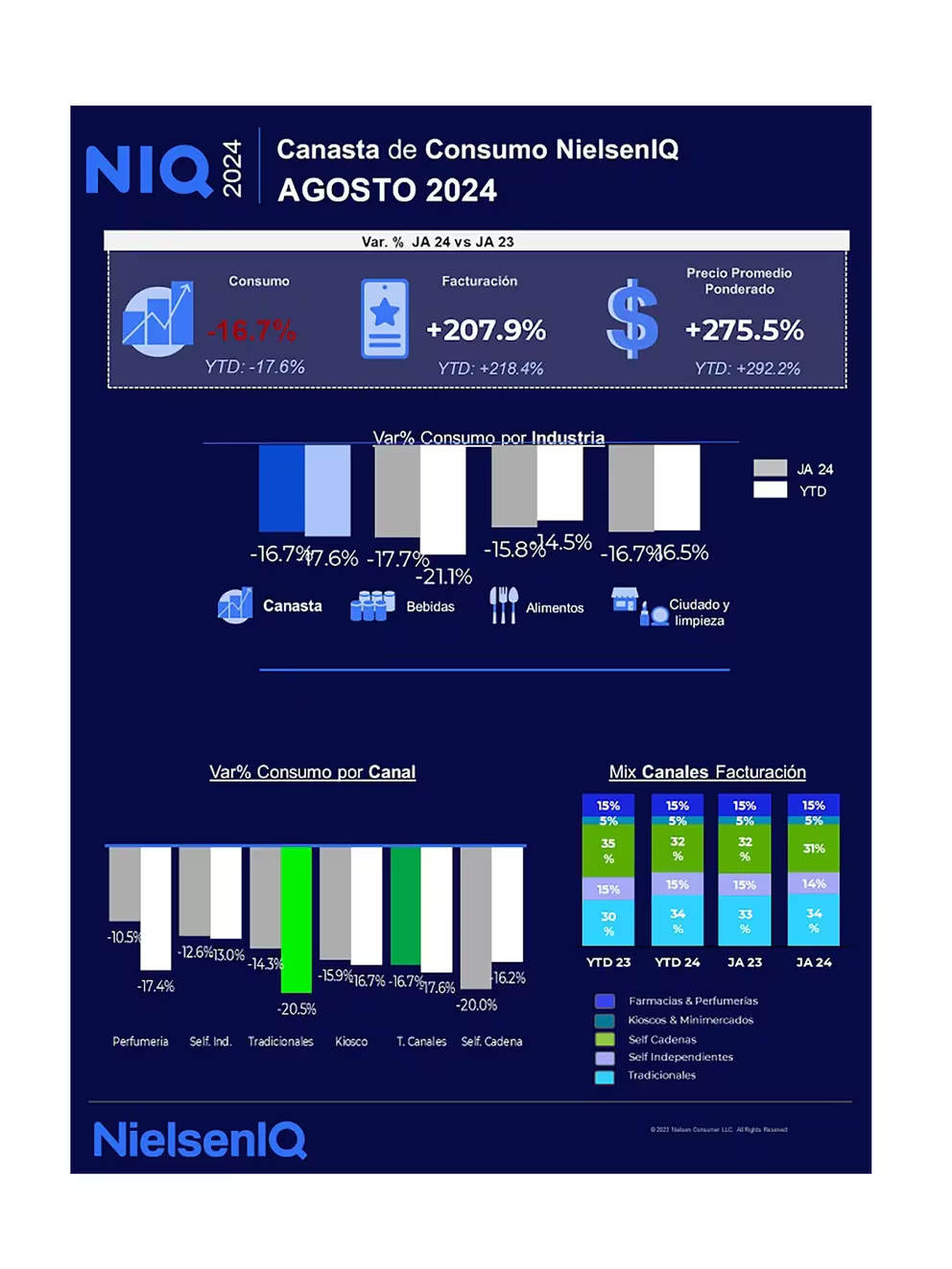 Todos los canales cerraron en negativo en el último bimestre (julio-agosto) y si bien en la comparación mensual algunos retailers afirman estar un poco mejor, las comparaciones interanuales seguirán siendo muy negativas, ya que el 2023 fue un año de fuerte consumo, especialmente en el último cuatrimestre del año, no sólo por la inflación sino también porque se acercaba la devaluación y los bienes serían luego mucho más caros.