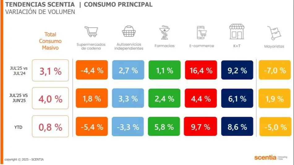 Concretamente, los rubros de consumo masivo (alimentos y bebidas, limpieza e higiene) aumentaron un 3,1% en julio pasado a comparación con julio de 2024, según mostró el último informe de la consultora Scentia. También hubo un crecimiento en el registro intermensual, en este caso del 4%.