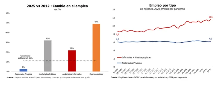 El estudio de Empiria recuerda que el mercado privado no genera empleo formal desde 2011 y sostiene que “La legislación vigente, obsoleta -cuyo cuerpo principal data de 1974- no fue inocua, sino que alentó una reforma laboral de hecho, sin los beneficios de una reforma de jure, pero sí con los costos de la informalidad y precarización de los contratos de trabajo”.