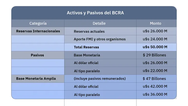 Para llegar a la cifra de 50.000 millones de dólares de reservas, se parte del préstamo del préstamo por 20.000 millones que la Argentina solicitó al FMI. A este monto se le sumarían no menos de 4.000 millones de dólares más correspondientes a créditos del Banco Interamericano de Desarrollo, del Banco Mundial y de la CAF (Banco de Desarrollo de América Latina). Las reservas brutas del BCRA en la actualidad se ubican cerca de los 26.000 millones de dólares.