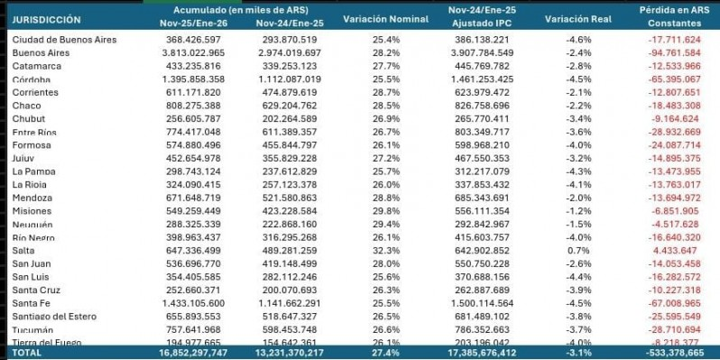 Las provincias tuvieron una variación nominal positiva de entre el 25 y el 33%, pero al ajustar por inflación, prácticamente todas sufrieron una variación real negativa.