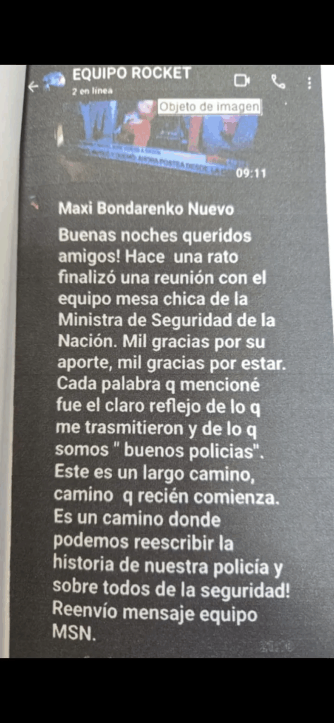 Además, una filtración de chats grupales, revelada anoche por C5N, terminó de agravar el escándalo. En el grupo de WhatsApp llamado “Equipo Rocket”, los policías debatían acciones concretas, se asignaban tareas y compartían consignas políticas, todo con el foco puesto en la campaña del excomisario. Uno de los mensajes mencionaba una reunión de Bondarenko con la ministra Patricia Bullrich para presentar su proyecto de seguridad, mientras se urgía al grupo a avanzar “en función de los pedidos que se desprendan de la charla”.