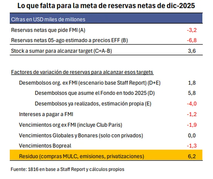 En el último informe, el FMI plantea que las reservas netas negativas lleguen a fin de año a los -u$s3.200 millones. Esto implicaría una acumulación de u$s3.600 millones, según los cálculos realizados por 1816 a precios de enero de 2025.