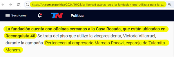 El 25 de octubre de 2024, poco después de aprobarse el contrato de PAMI con Pocovi, varios medios publicaron que el gobierno avanzaba con la creación de una fundación libertaria, la Fundación Faro, y que la misma contaría con oficinas cercanas a la Casa Rosada, ubicadas en Reconquista 40. Escribió TN: “Pertenecen al empresario Marcelo Pocovi, expareja de Zulemita Menem“.