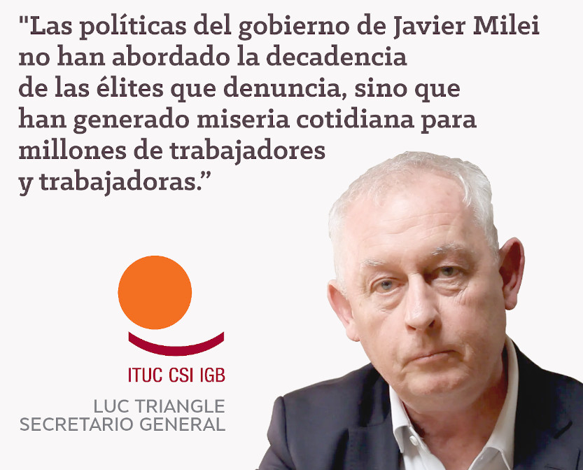 Para la CSI, las políticas de Milei son una “terapia de choque” frente a las cuales los sindicatos argentinos se han convertido en “la principal oposición cohesionando la resistencia en defensa de los derechos de los trabajadores y de principios democráticos más amplios”.