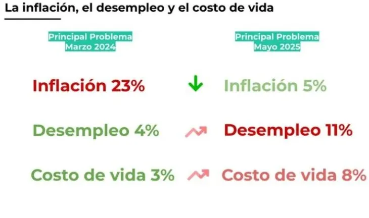 En contraste, la inflación, que en marzo ocupaba el primer lugar con un 23%, cayó hasta el 5% en mayo, una baja de 18 puntos porcentuales, reflejando una modificación en las prioridades de la ciudadanía a medida que otros indicadores cobraron mayor urgencia.