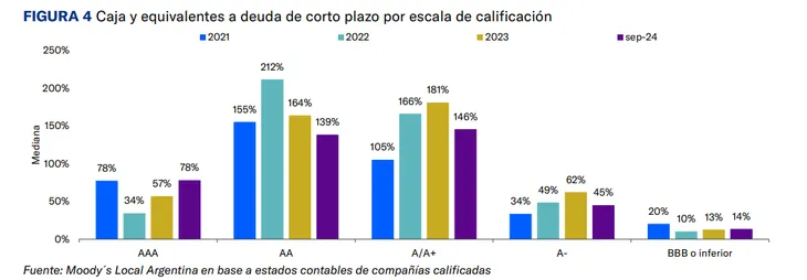 «Producto de la caída en el nivel de la actividad en los primeros meses de 2024, sumado a menores alternativas de financiación en el mercado de instrumentos bursátiles dólar linked, el nivel de liquidez de las compañías se deterioró en 2024, principalmente en emisores con calificación de A-.ar y se mantiene en niveles ajustados para empresas calificadas en el rango de BBB o inferior», enfatizó el reporte de la firma.