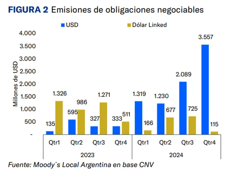 Según los números de Moody’s, la cantidad de emisiones dólar linked disminuyó a u$s1.700 millones desde niveles récord de u$s4.000 millones en 2023. En el mismo sentido, los plazos de emisiones cayeron a 27 meses en 2024, desde 36 en 2023 y la TIR promedio de colocación subió a 4,7% desde -0,9% en 2023.