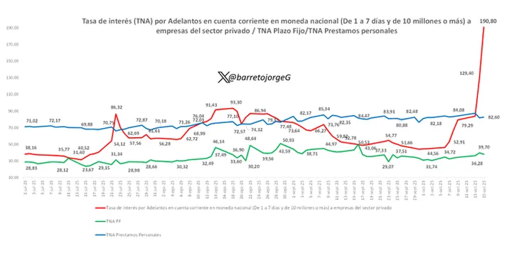 El dato corresponde al 15 de octubre y figura en la base de datos del Banco Central. El salto se debe a la gran inestabilidad financiera que comenzó a mediados de julio cuando el Ministerio de Economía decidió dejar de darle continuidad a las Letras Fiscales de Liquidez (LEFIs), que era el instrumento para manejar la liquidez diaria de los bancos.
