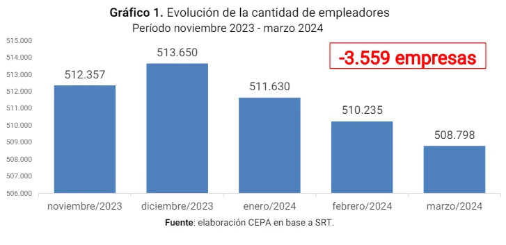 Aunque el día las pymes se celebra mundialmente todos los 27 de junio, este año las pequeñas y medianas empresas argentinas no tienen nada que festejar: en los primeros tres meses de gobierno de Javier Milei, ya cerraron unas 3.500, revirtiendo el pico máximo de diciembre pasado. Se trata de un ritmo inédito de destrucción del entramado productivo. Concretamente, la cantidad de empleadores en el país bajó de 513.650 en diciembre a 511.630 en enero, 510.235 en febrero y finalmente 508.798 en marzo. Es decir, 3.559 empresas perdidas en tres meses, a razón de casi 40 por día, según reveló un informe del CEPA basado en datos de la Superintendencia de Riesgos de Trabajo de la Nación.