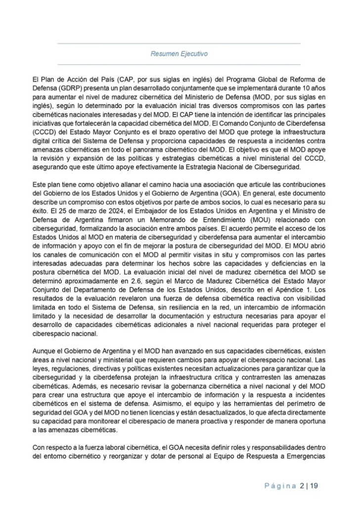 El 9 de octubre de 2024 se presentó el PAP luego del relevamiento efectuado por el experto estadounidense a los organismos militares del sector ciber y determinado el nivel de actualización, capacitación y respuesta cibernética con el objetivo de mejorar la postura de ciberseguridad del sistema de Defensa.
