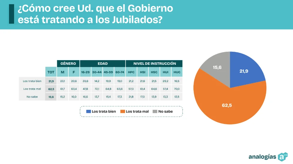 La encuesta de Analogías consta de 2.612 casos recogidos entre el 7 y el 9 de diciembre. El 62,5% consideró que el Gobierno «trata mal» a los jubilados, el 21,9% aseguró que los «trata bien» y 15,6% dijo no saber qué responder.