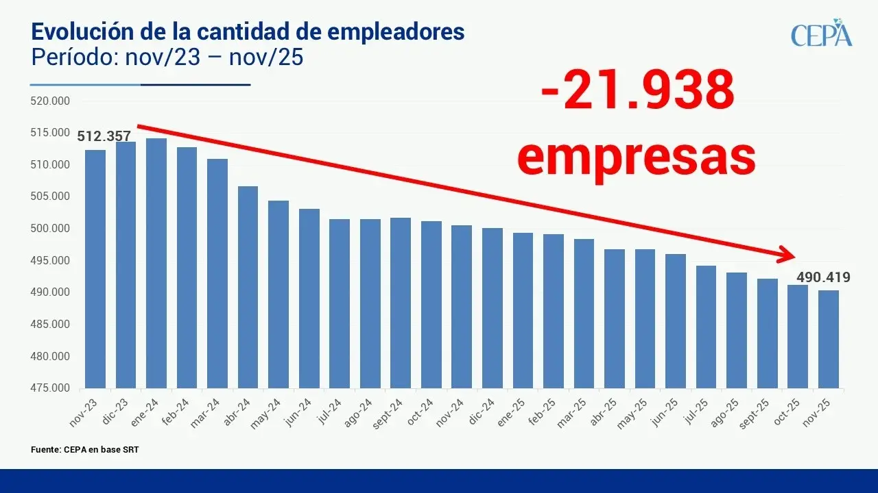 En diciembre de 2023, el Boletín Estadístico de la Superintendencia de Riesgos del Trabajo (SRT) arrojaba un total de 512.898 compañías a lo largo y ancho del territorio. El último reporte conocido este mes -que toma los números a noviembre de 2025– indica que hay 490.419 empresas. Es decir que, según los datos oficiales, hubo 22.479 unidades productivas que tuvieron que cerrar desde que Milei es presidente.