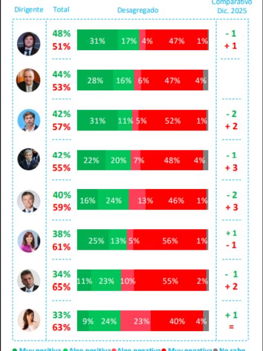 El segundo que se metió en la disputa es el actual jefe de Gabinete Manuel Adorni, con una aprobación del 44 % y una imagen negativa del 53 %. Apenas por debajo del gobernador bonaerense queda el ministro de Economía Luis Caputo, y les sigue el expresidente Mauricio Macri.