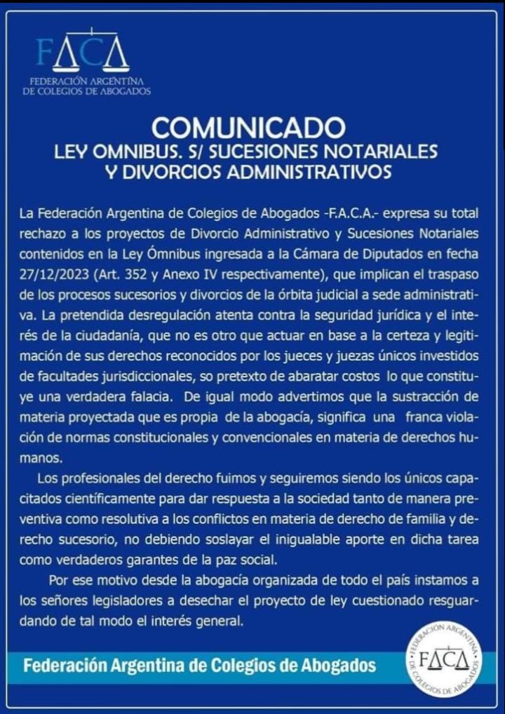 LA FEDERACIÓN ARGENTINA DE COLEGIOS DE ABOGADOS TAMBIÉN SE PRONUNCIÓ