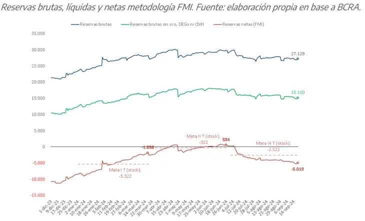 La consultora LCG realizó un cálculo similar: “En la metodología FMI, las reservas netas se ubican en torno a -u$s4.900 millones, acumulando u$s6.350 millones desde el 7 de diciembre de 2023. Restan sumar otros u$s2.350 millones en lo que queda del mes para cumplir la meta fijada para el tercer trimestre de 2024 (u$s8.700 millones), lo cual será muy difícil de concretar, salvo que se consiga algún financiamiento de magnitud”.