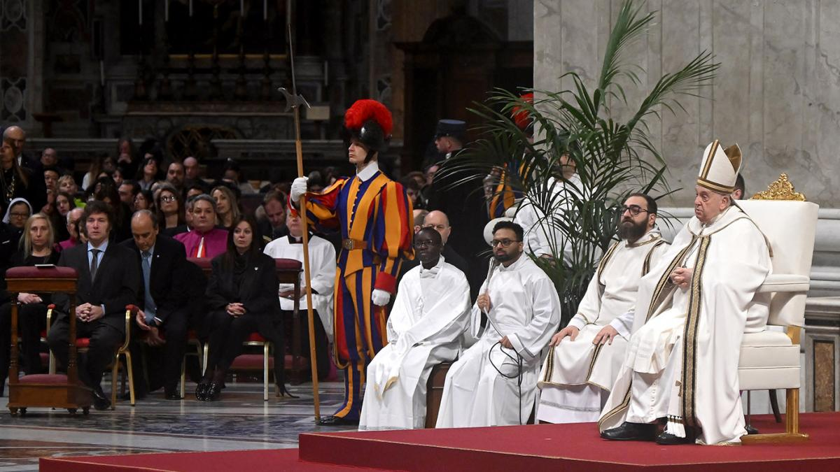 Miles de personas se congregaron en la Basílica de San Pedro para la celebración eucarística de casi dos horas de duración presidida por el pontífice y en la que estuvo, entre otras autoridades, el presidente Javier Milei, que fue buscado por muchos fieles para sacarse fotos.