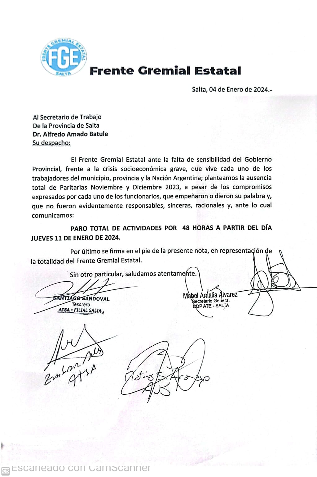 Todos estos antecedentes impulsaron al Frente Gremial Estatal, a pronunciarse y ejecutar el primer paro del año en la Provincia de Salta sin asistencia a los lugares de trabajo. El Frente Gremial Estatal de Salta está conformado por UPCN Seccional Salta, AMET, UDA, SADOP, ATE, CGT, la CTA Autónoma, la Agremiación Judicial, IPV, SITRAVPS, ATSA, UPES y APSADES. Resta confirmar adhesiones, modalidades y estrategias de varios integrantes, algo que seguramente sucederá entre hoy y los primeros días de la semana entrante.
