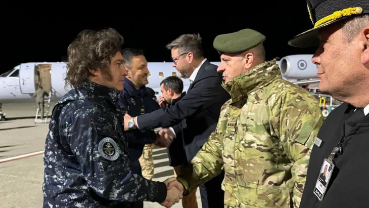 El presidente arribó cerca de las 23.21 a la ciudad patagónica, acompañado por la secretaria General de la Presidencia, Karina Milei; el ministro de Defensa, Luis Petri; y el jefe de Gabinete, Nicolás Posse.