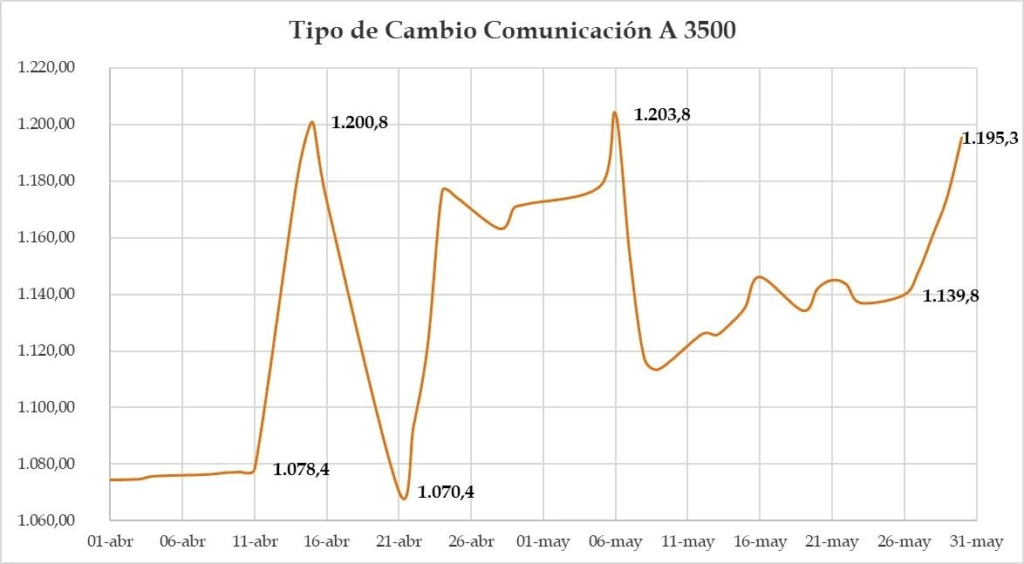 El dólar llegó al máximo de $ 1.215 pesos, en el marco de la demanda extraordinaria que metió la Ciudad de Buenos Aires, que afronta vencimientos de deuda por u$s 300 millones. El lunes hay vencimientos de deuda por más de u$s 500 millones. En el “trimestre de oro” el BCRA no acumula reservas y en mayo cayeron más de 2.000 millones.