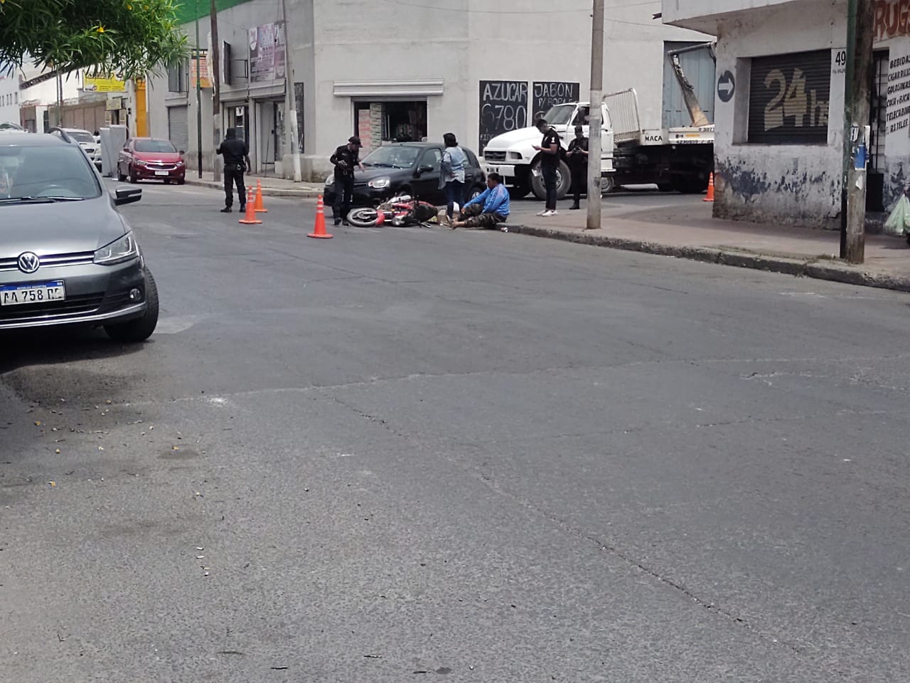 Hace breves minutos hubo una colisión entre un automóvil y una motocicleta conducido por un hombre mayor de edad. Se hizo presente personal de la Policía de la Provincia a los pocos minutos de sucedido el hecho en el lugar del choque efectuando el distanciamiento mediante los conos reflectantes para resguardar el lugar y realizar el posterior peritaje.